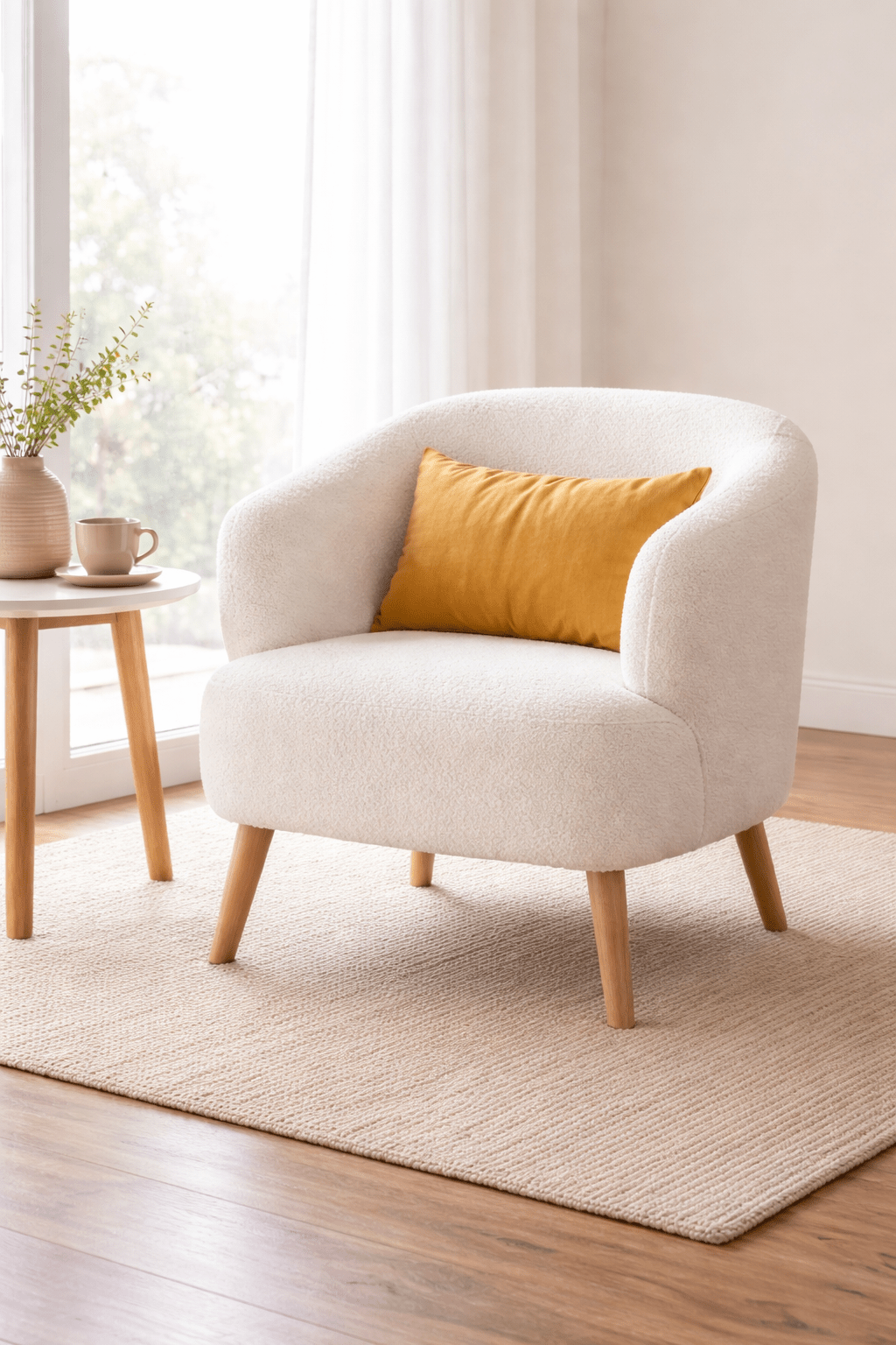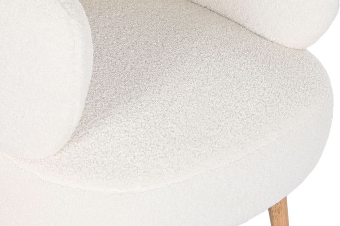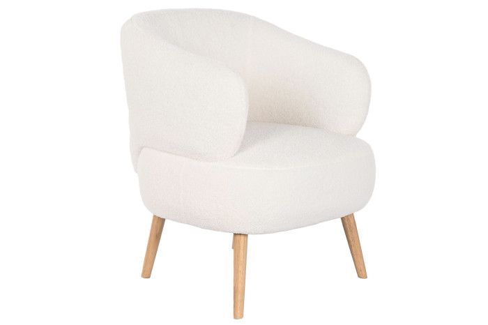 Su forma redondeada, con líneas suaves y orgánicas, junto con las patas de madera en tono natural, crean un equilibrio perfecto entre confort y diseño. Es una pieza ideal para salones, dormitorios o rincones de lectura, especialmente en ambientes de estilo nórdico, contemporáneo o natural.