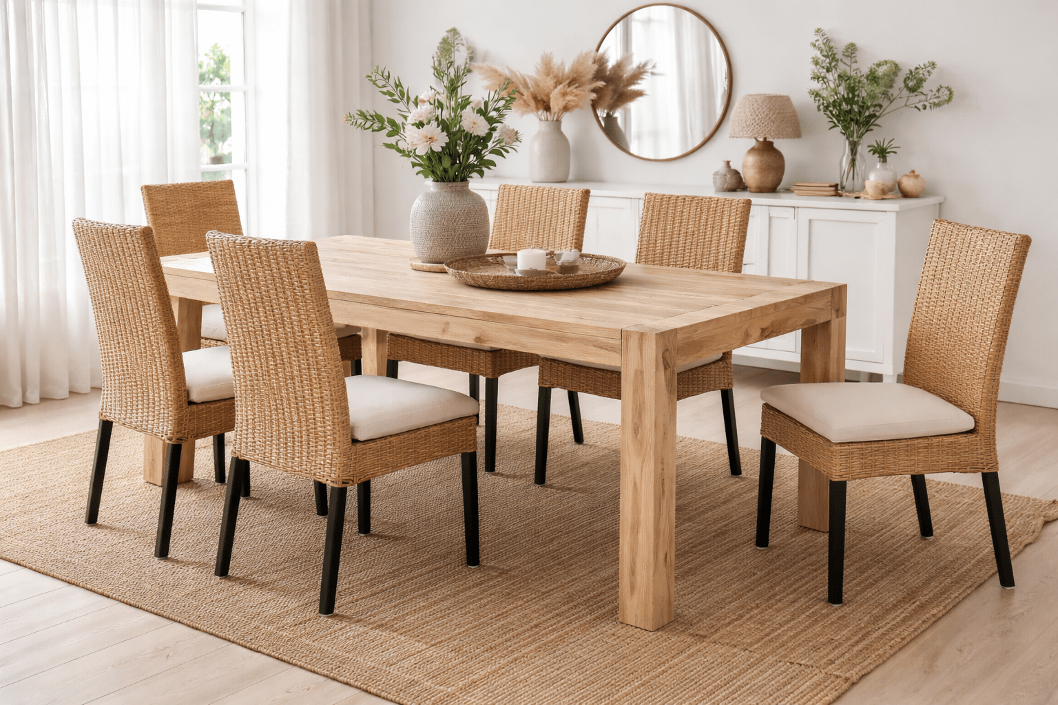 Con unas medidas de 200 x 100 x 76 cm, ofrece una superficie amplia y cómoda para comidas familiares, reuniones o celebraciones. Esta mesa de comedor de teca natural aporta calidez y personalidad sin sobrecargar el ambiente, convirtiéndose en el centro del hogar.
