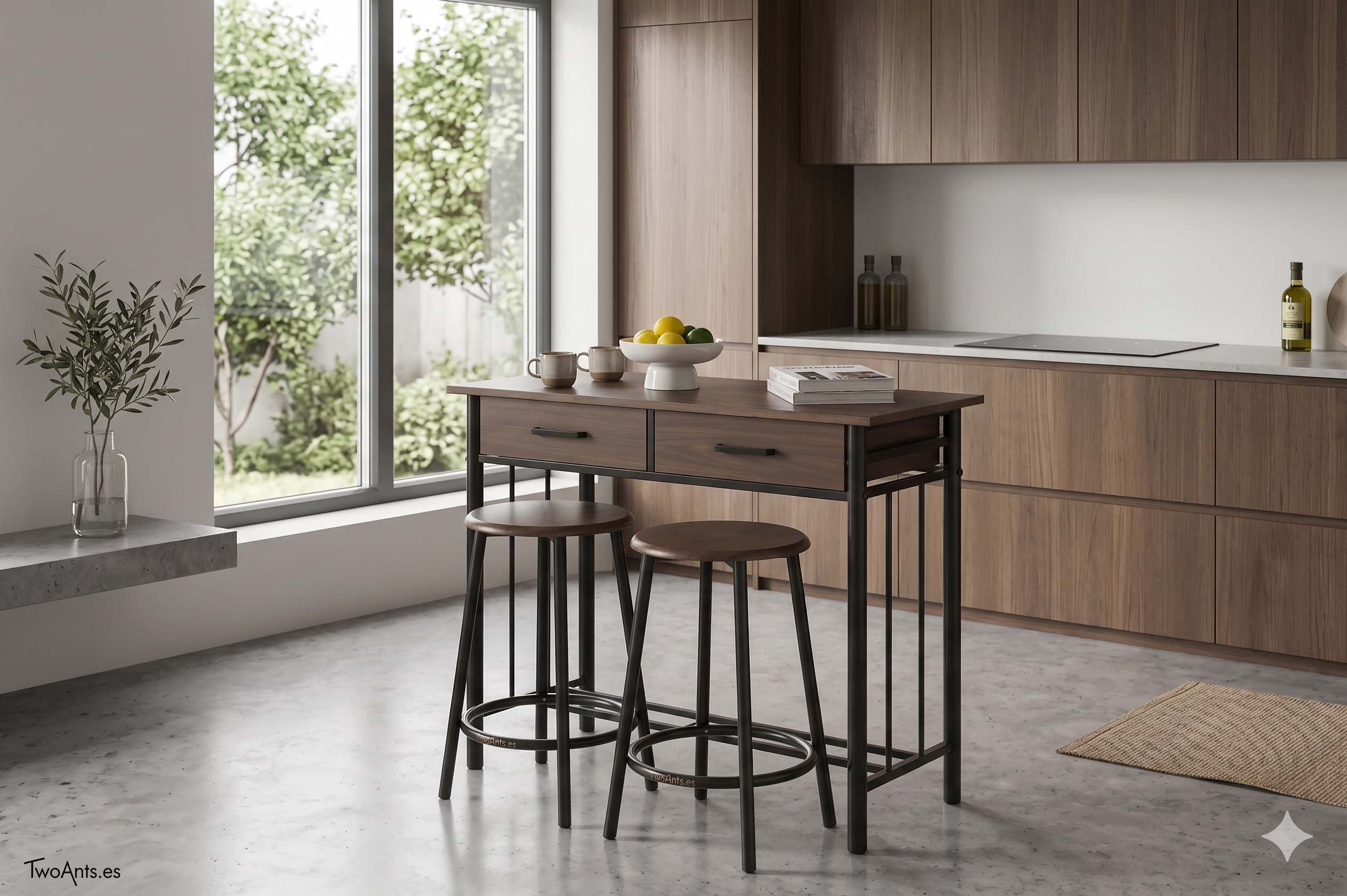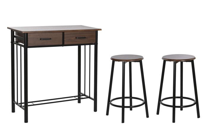 La Mesa Set Metal MDF es un conjunto de mesa alta con 2 taburetes, ideal para cocinas pequeñas, comedores o zonas office. Su diseño en metal negro y acabado efecto madera combina estilo, funcionalidad y almacenaje gracias a sus 2 prácticos cajones ✨