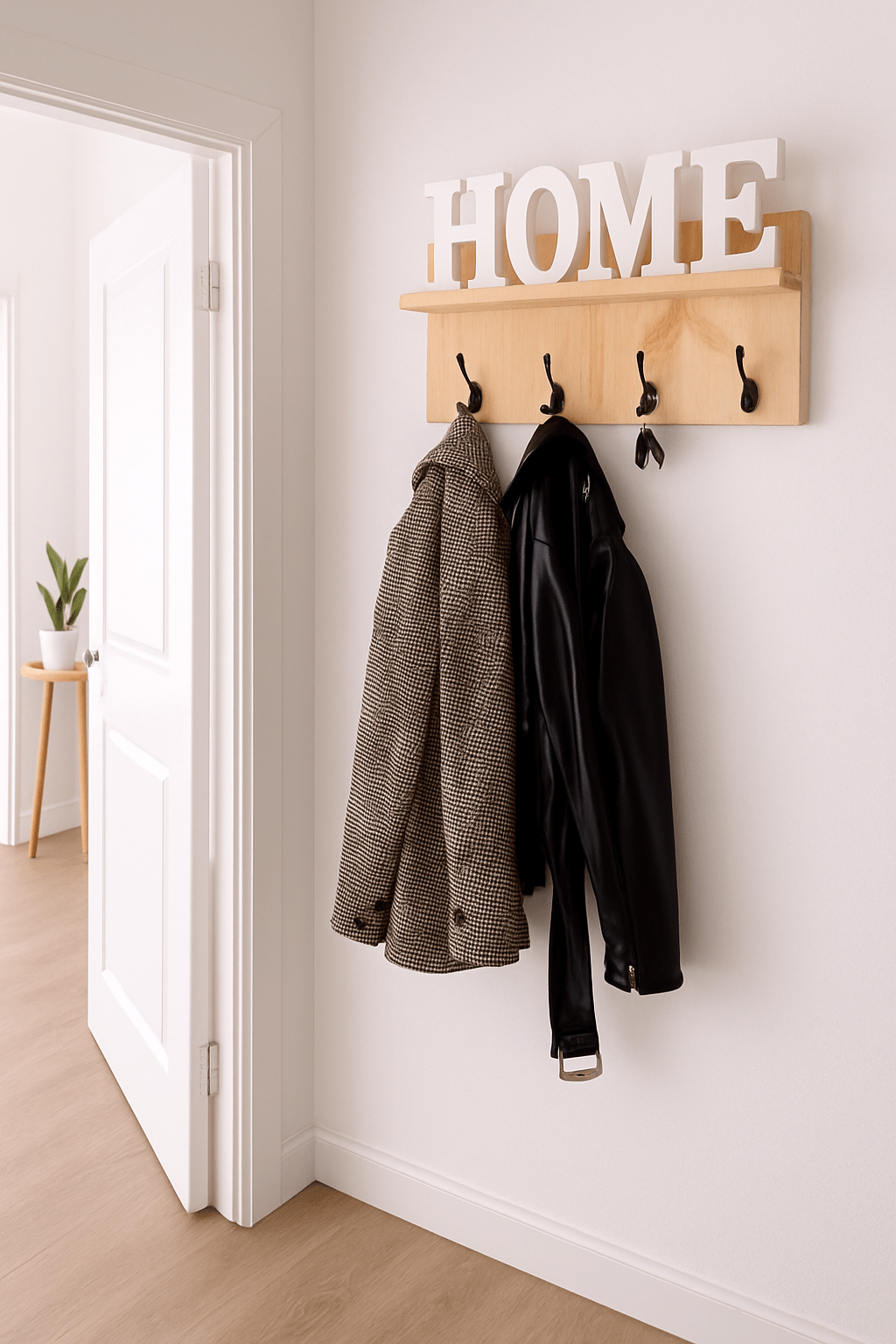 🌿 Dale un toque de encanto nórdico y funcionalidad a tu hogar con nuestro Perchero de Pared de Madera. Este hermoso perchero hecho a mano, es perfecto para mantener tu entrada, pasillo, cocina o dormitorio ordenado y con estilo. Con su estante superior y cuatro ganchos de metal, combina diseño y practicidad en una sola pieza. 🛋️💖