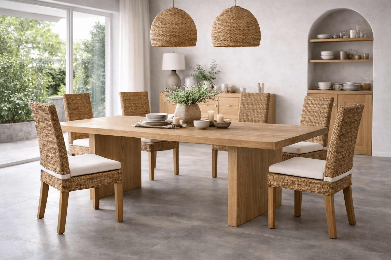 Gracias a su diseño equilibrado, estas sillas de comedor de fibra natural encajan perfectamente en espacios de estilo mediterráneo, nórdico, rústico o contemporáneo. Incluyen cojín acolchado en tono claro, pensado para ofrecer una sentada cómoda sin romper la estética natural del conjunto.